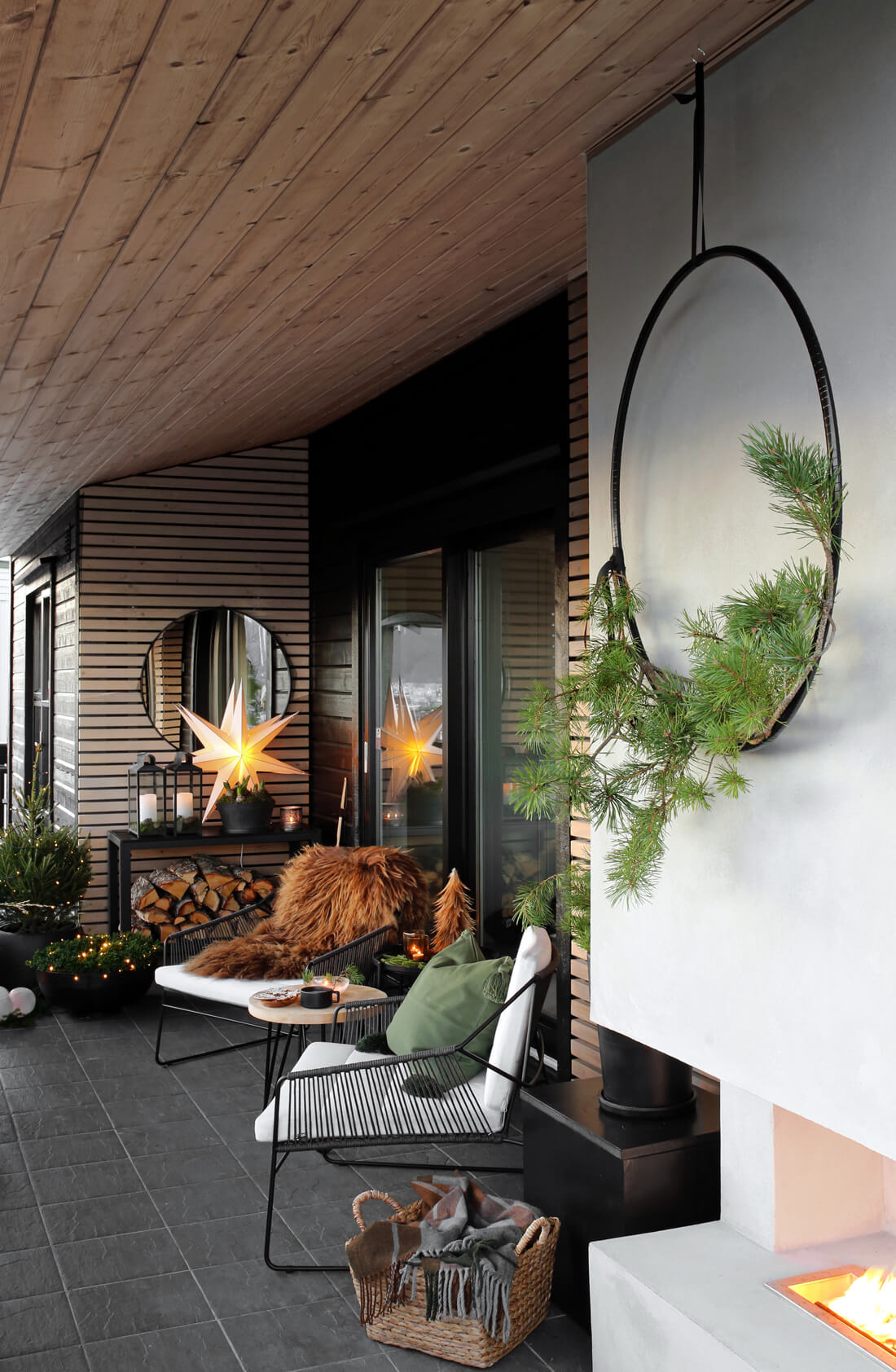 The classic charm of twinkling lights and garlands never fails to create a cozy and festive atmosphere. Consider draping fairy lights along the railing or balcony edges for a warm and inviting glow. Combine them with lush green garlands intertwined with small ornaments to add a touch of nature and elegance to your outdoor space.