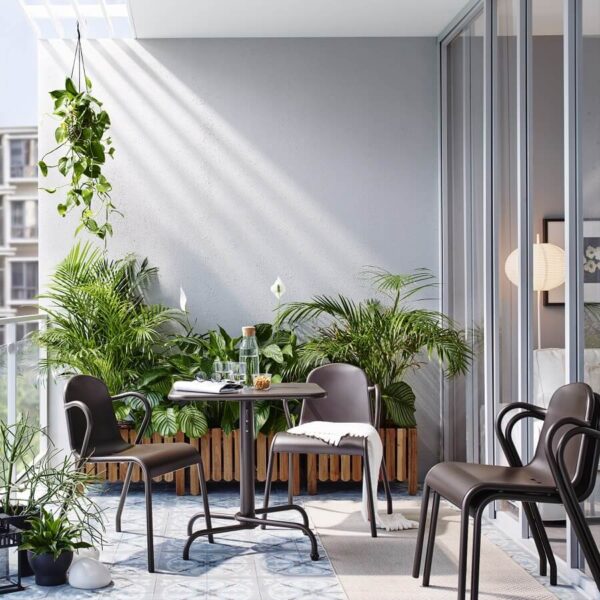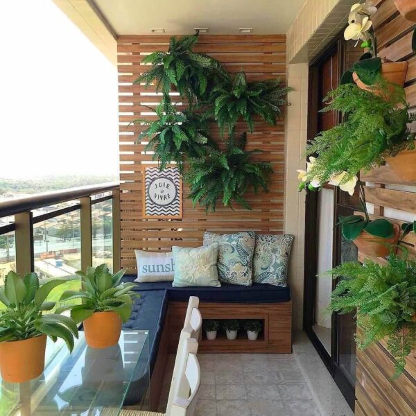 Elevate your balcony’s comfort level by incorporating seating areas amidst the greenery. Arrange cozy chairs or a small bench surrounded by potted plants for a relaxing retreat. Use weather-resistant cushions and textiles to create an inviting space.