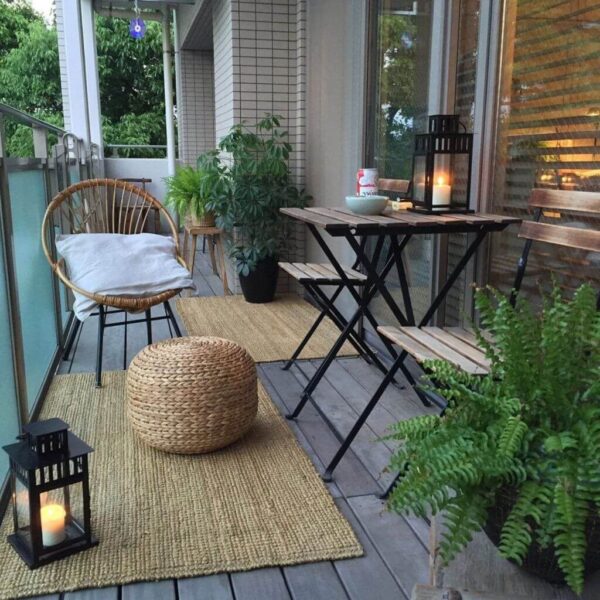 Introduce a touch of nature with bamboo screens, reed mats, or bamboo furniture. These elements infuse a serene, organic vibe into your balcony.
