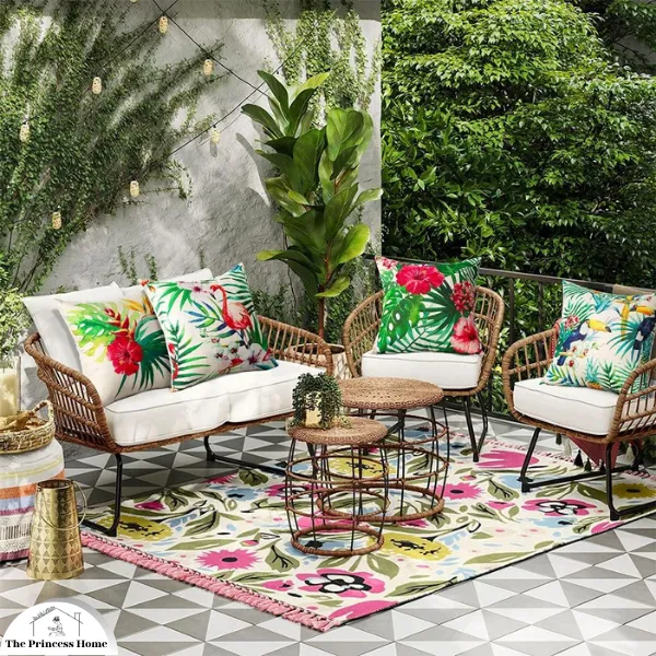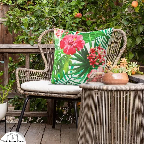 Here’s how you can infuse your outdoor area with lush greenery, palm leaf prints, and tropical-inspired accessories: