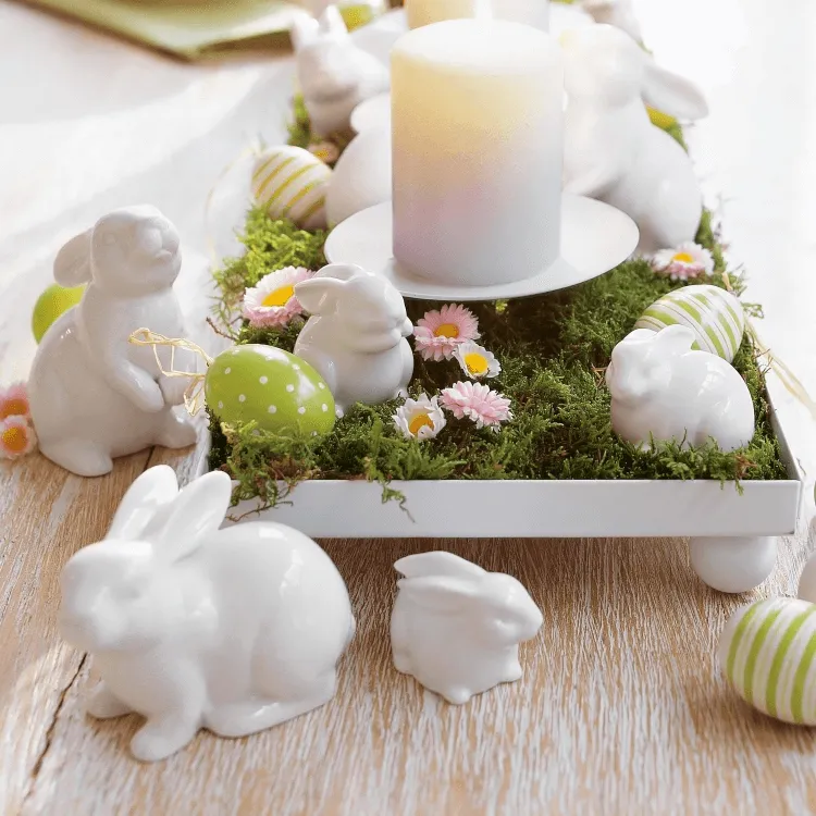 For a more rustic and earthy touch, consider using moss-covered bunny topiaries as your centerpieces. These whimsical creations evoke the image of bunnies frolicking in the meadow. You can either purchase ready-made moss bunnies or create your own by shaping wire frames and covering them with moss. These centerpieces work exceptionally well for garden-themed events and outdoor gatherings.