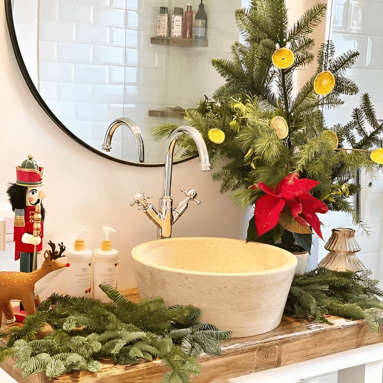 Bring the outdoors in by incorporating seasonal greenery. Place a potted poinsettia or a small Christmas tree in a corner of your bathroom. This natural touch adds warmth and freshness to the space.