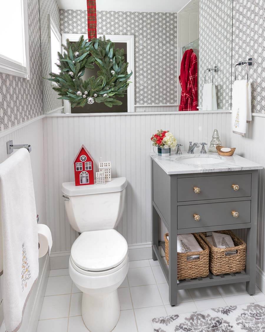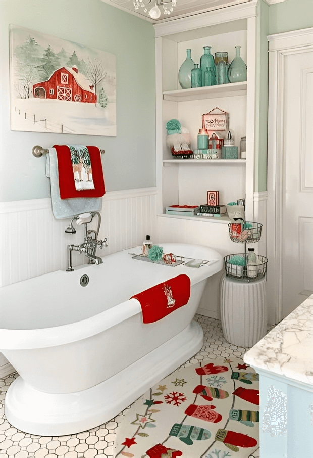 Instead of traditional storage containers, use holiday-themed baskets or bins to store toiletries and towels. These can be both functional and decorative, contributing to your Christmas bathroom decor theme.