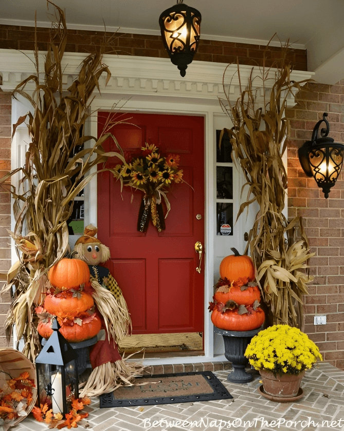 No fall entry is complete without pumpkins. Create a mini pumpkin patch on your porch by placing an assortment of pumpkins in various sizes and colors. You can even add some hay bales and cornstalks to enhance the rustic charm.