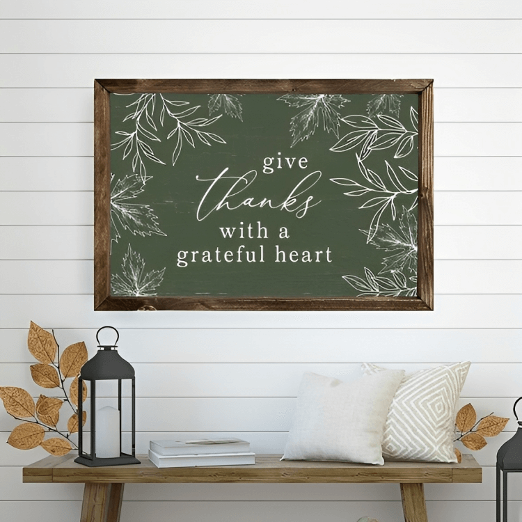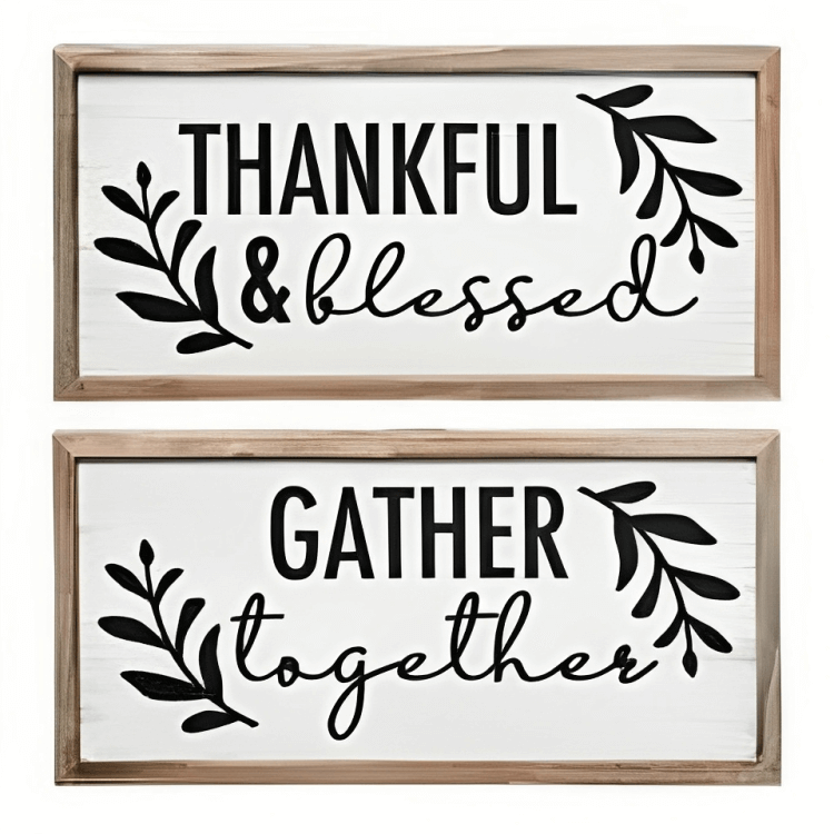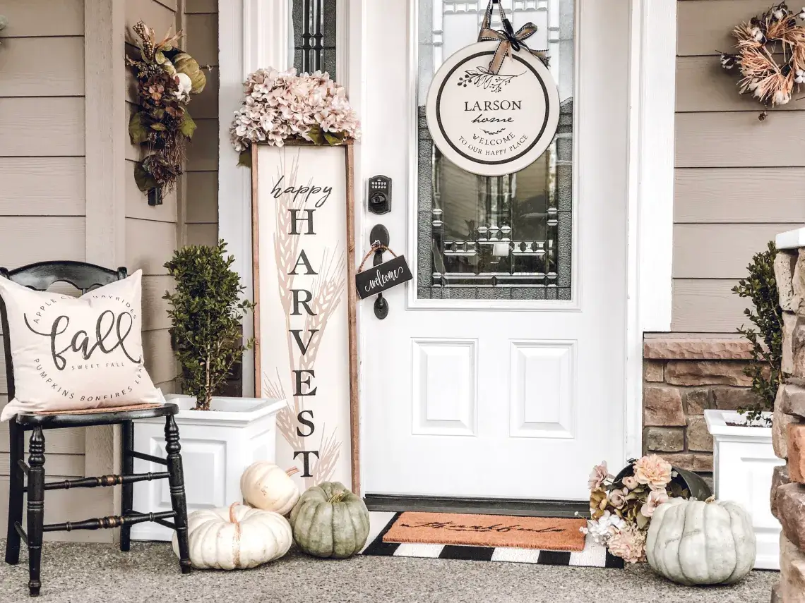 Create custom signs with fall-themed phrases or quotes like “Gather Here” or “Thankful & Blessed.” These signs can be hung on your front door or leaned against your porch for a warm welcome.