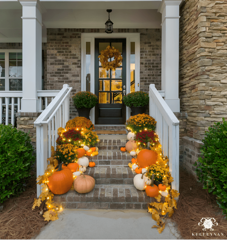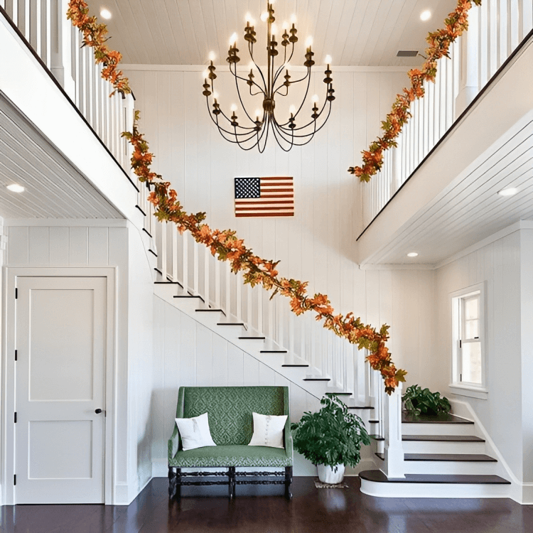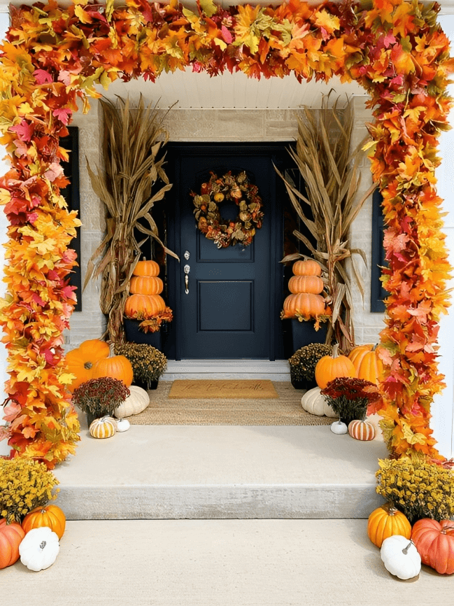 Decorate your porch railing or entryway with fall foliage garlands. These can be made from real leaves, faux leaves, or even fabric in autumnal colors. Twine them around banisters or drape them over your porch railing for an enchanting effect.