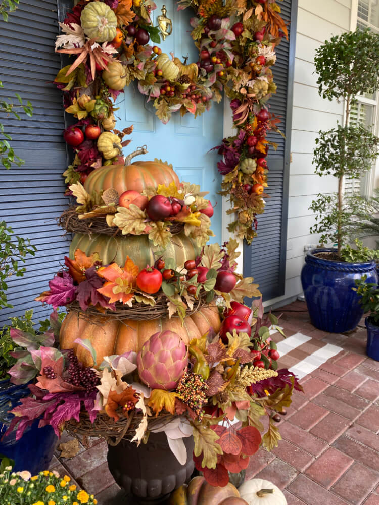 Stack different-sized pumpkins to create topiaries on either side of your entry. You can paint them or leave them natural for a delightful focal point.