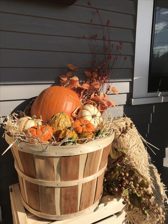 Create stunning floral arrangements using fall flowers like chrysanthemums, sunflowers, and marigolds. Add dried wheat stalks or branches for an extra touch of rustic elegance. Place these arrangements in decorative pots or buckets on your porch.