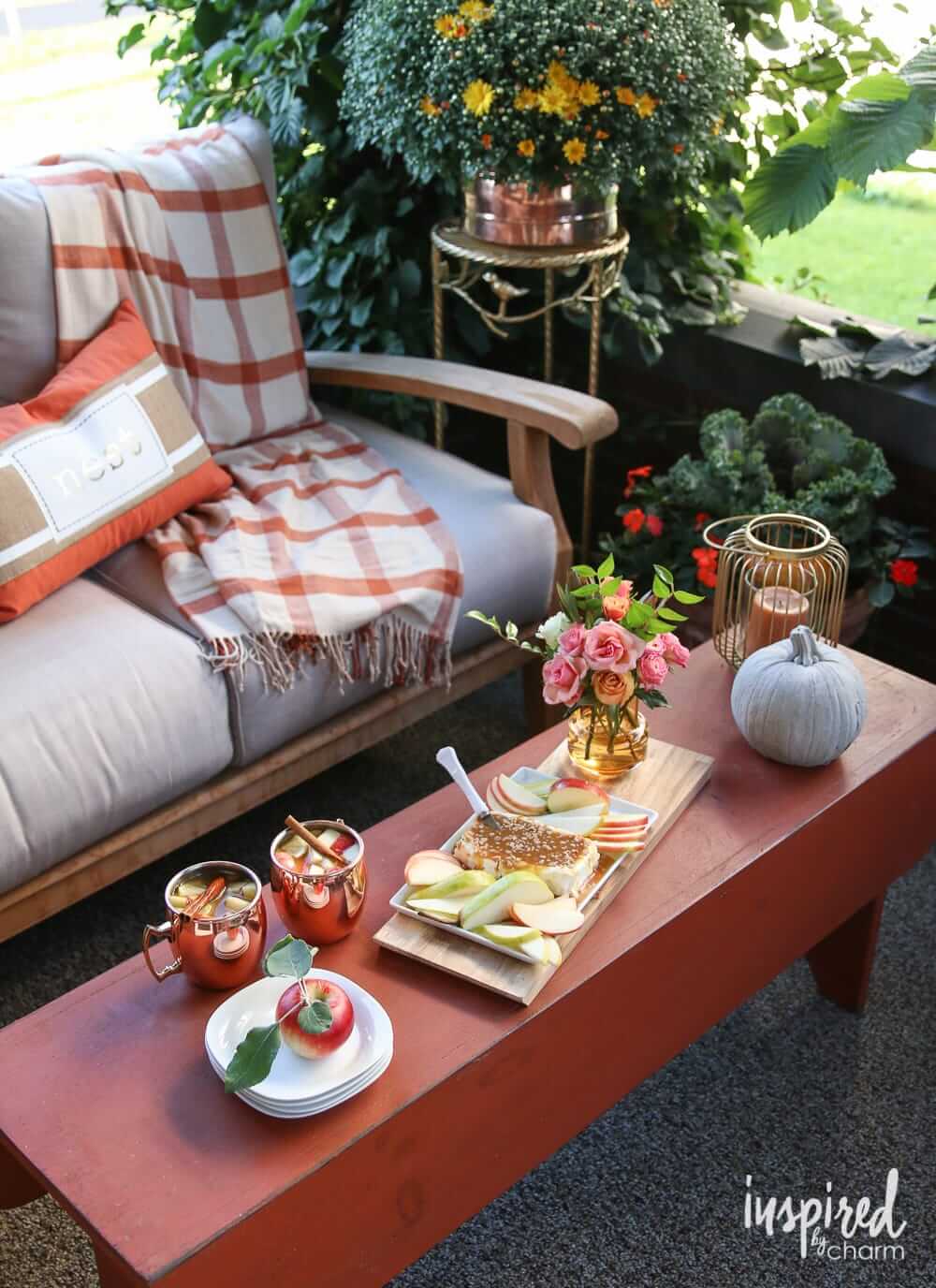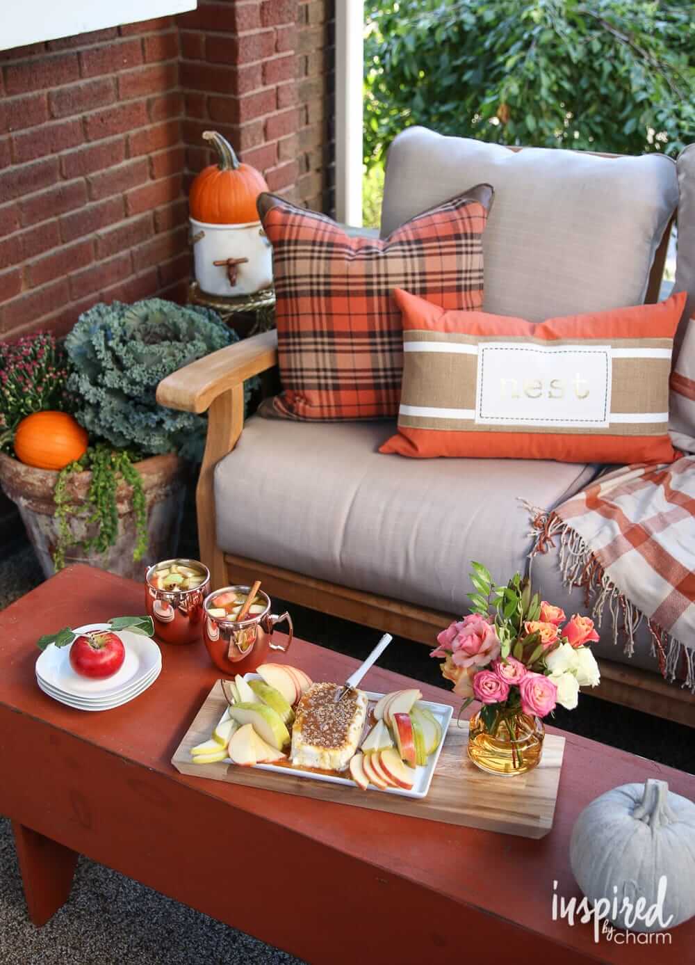 If you have the space, add a quaint bench with plump cushions and cozy throws to create an inviting seating area on your porch. It’s a perfect spot for sipping cider or enjoying the crisp fall air.