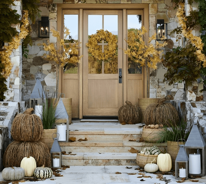 Lanterns and candles create a magical ambiance during the fall season. Line your entryway with lanterns filled with LED candles for a warm, inviting glow. Opt for lanterns with a rustic or farmhouse design for that quintessential fall look.