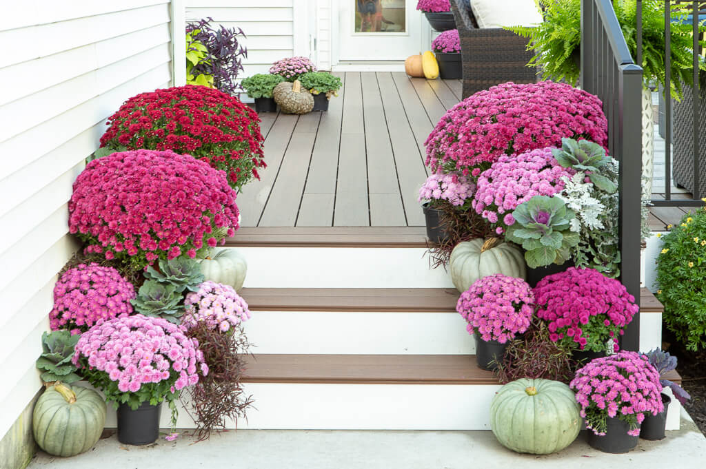 Enhance your entry with vibrant chrysanthemums in pots or baskets. These hardy flowers come in various fall colors and can thrive in cooler temperatures.