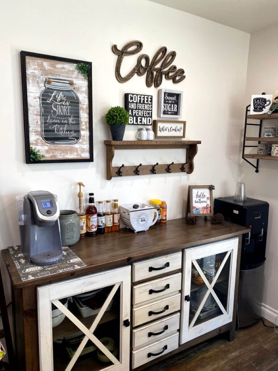 Rustic shelving is a fantastic addition to your fall coffee bar. Install open wooden shelves or floating shelves to display your coffee mugs, beans, and other essentials. Adding distressed wood or reclaimed materials can evoke a charming, countryside feel.