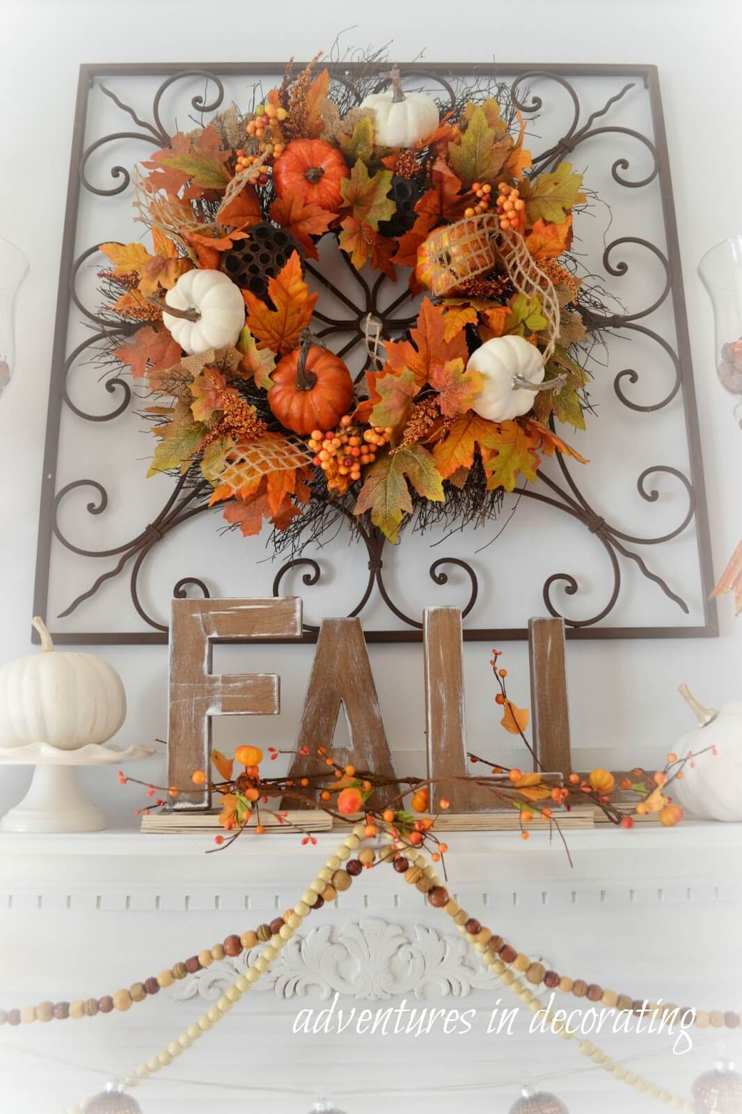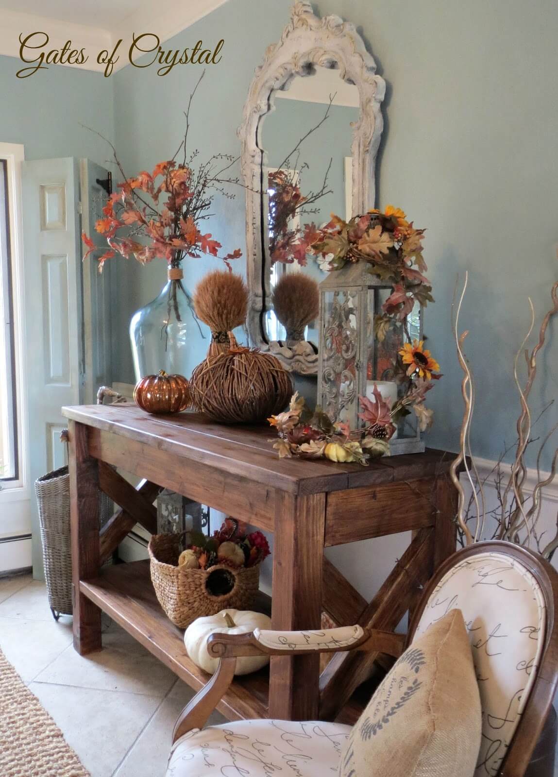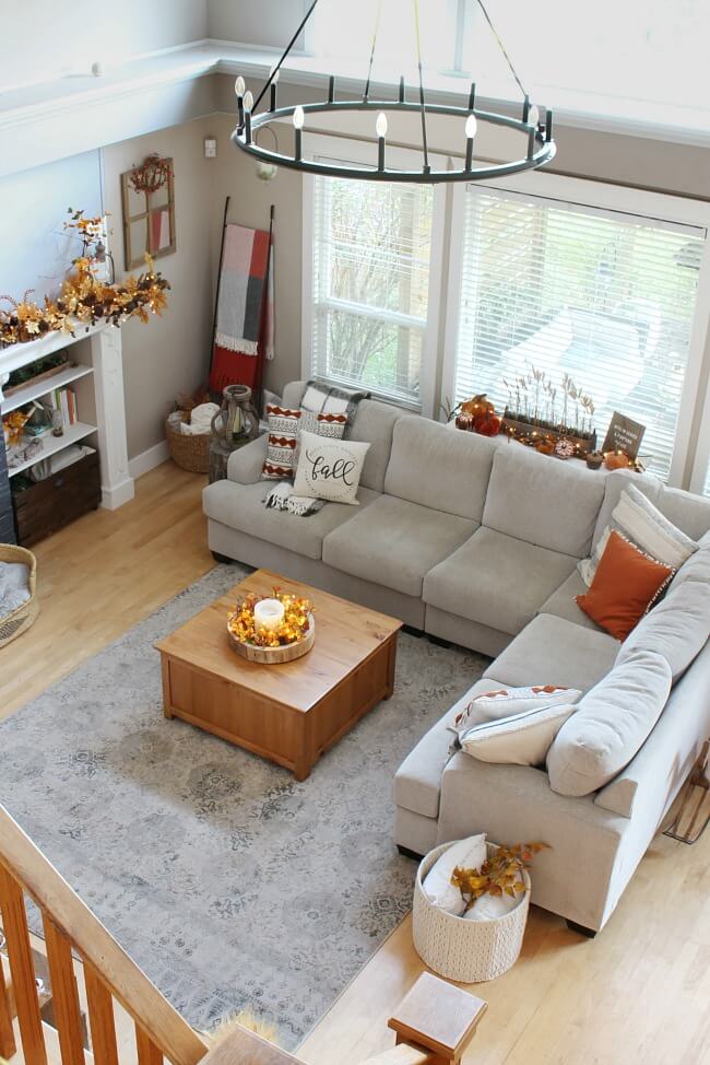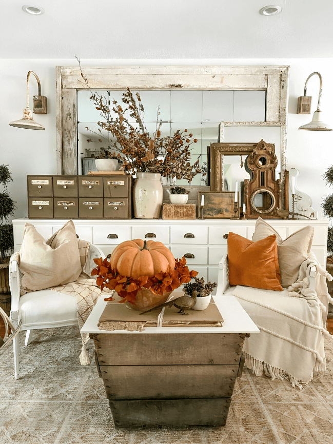 If you have a fireplace, the mantel provides an excellent opportunity to showcase your farmhouse fall decor. Arrange a collection of pumpkins, lanterns, and candles on the mantel. Consider adding a rustic, distressed mirror or a large piece of fall-themed artwork above the fireplace for added impact.