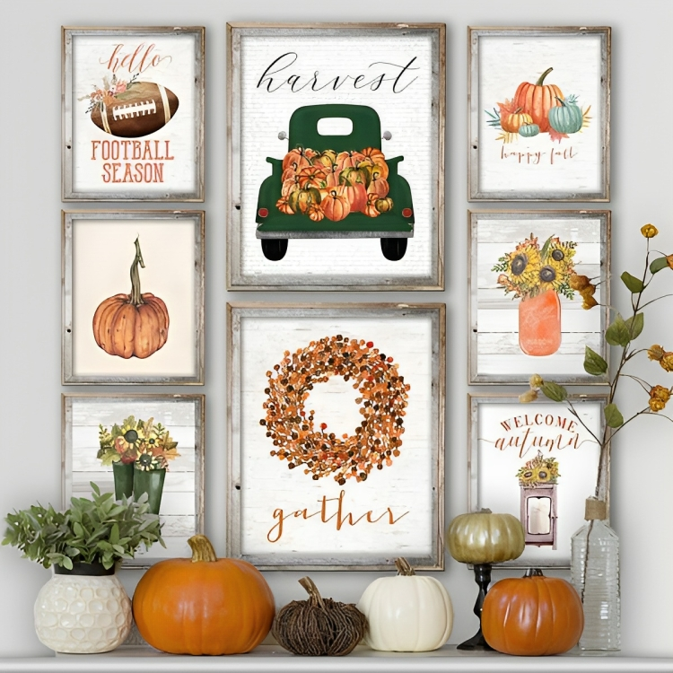 Adorn your walls with rustic farmhouse wall art that evokes the beauty of autumn. Look for wooden signs with fall-themed quotes or vintage-style botanical prints featuring leaves and pumpkins. You can also hang a fall-inspired wreath or a collection of framed family photos in rustic wooden frames.