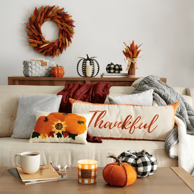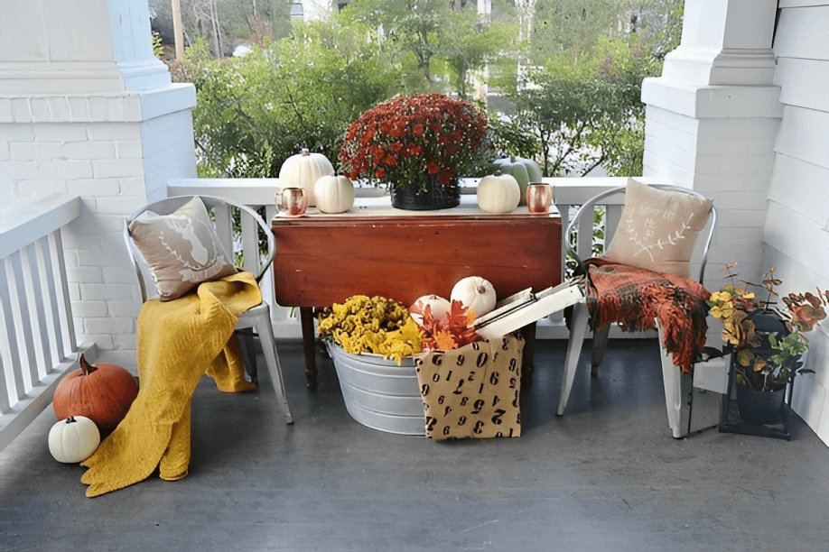 Extend your fall decor to your outdoor spaces. Hang a wreath on your front door and adorn your porch or patio with cozy throws and pillows on outdoor furniture. Place pumpkins, hay bales, and potted mums to create a welcoming outdoor scene.