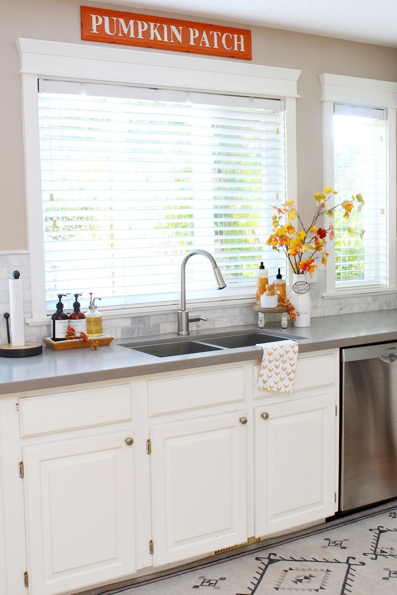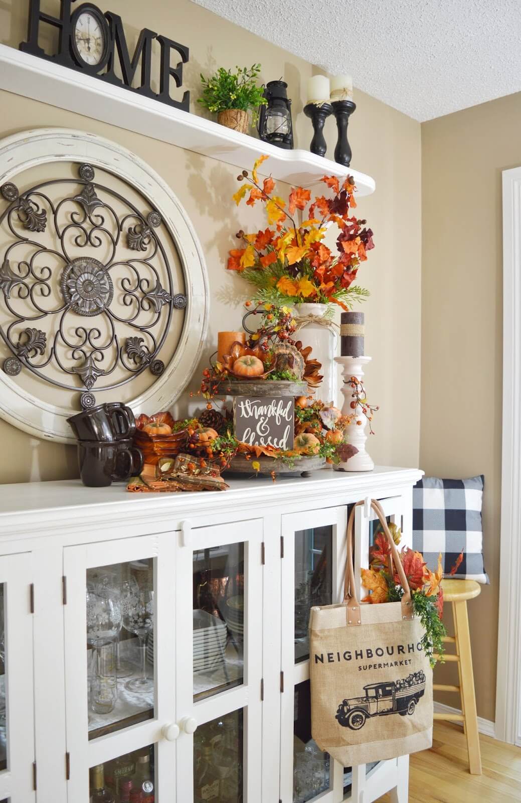 Your kitchen can be a central hub for fall decor. Adorn open shelves with vintage-inspired mugs, platters, and canisters in warm fall colors. Hang a wreath on your kitchen window and add a bouquet of fresh fall flowers to your dining table.