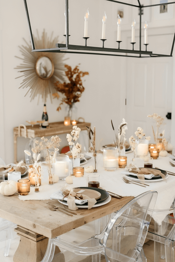 Dress up your dining table with a farmhouse-inspired fall tablescape. Use a burlap table runner as a base and arrange mason jars filled with fall blooms, candles in rustic holders, and wooden chargers. Add a touch of elegance with vintage-inspired flatware and dinnerware.