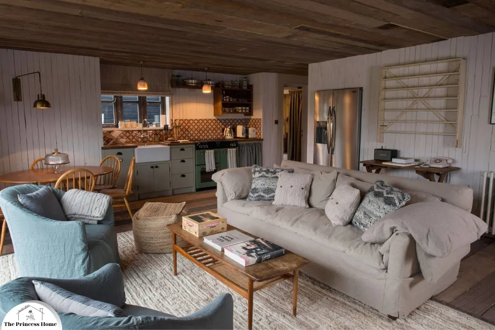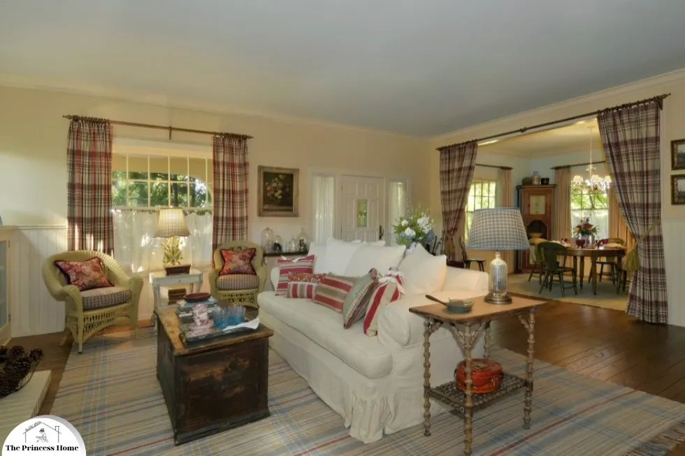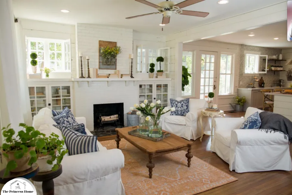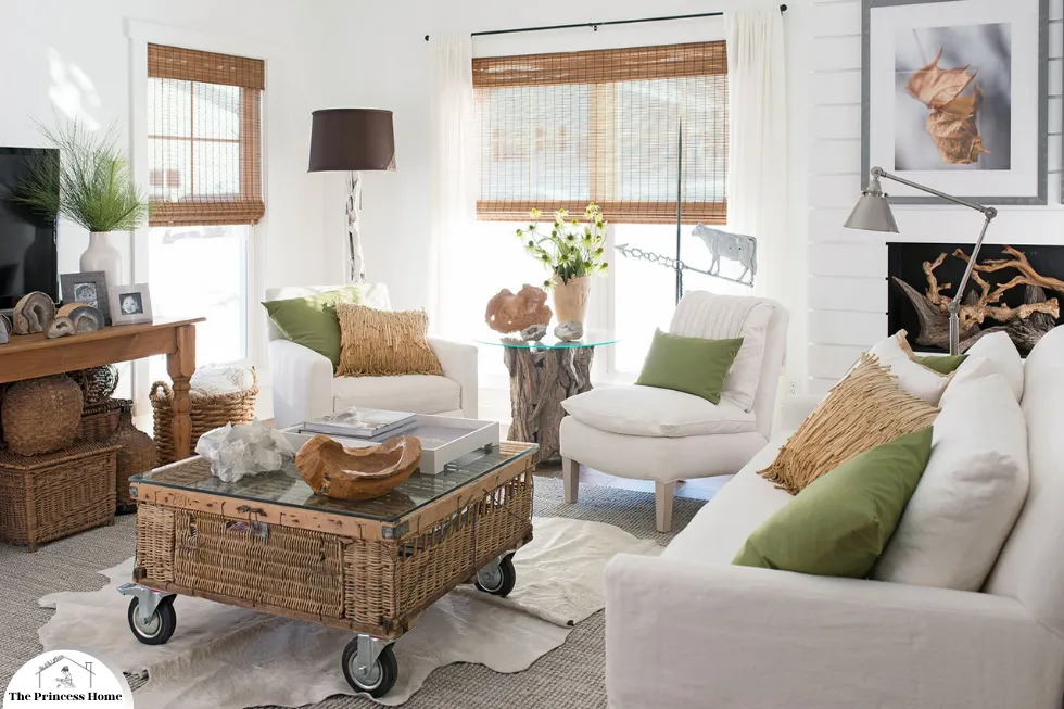 Decorate the living room with farmhouse-inspired decor such as mason jar vases, galvanized metal buckets, and woven baskets. These accessories add a rustic touch and tie the room together.
