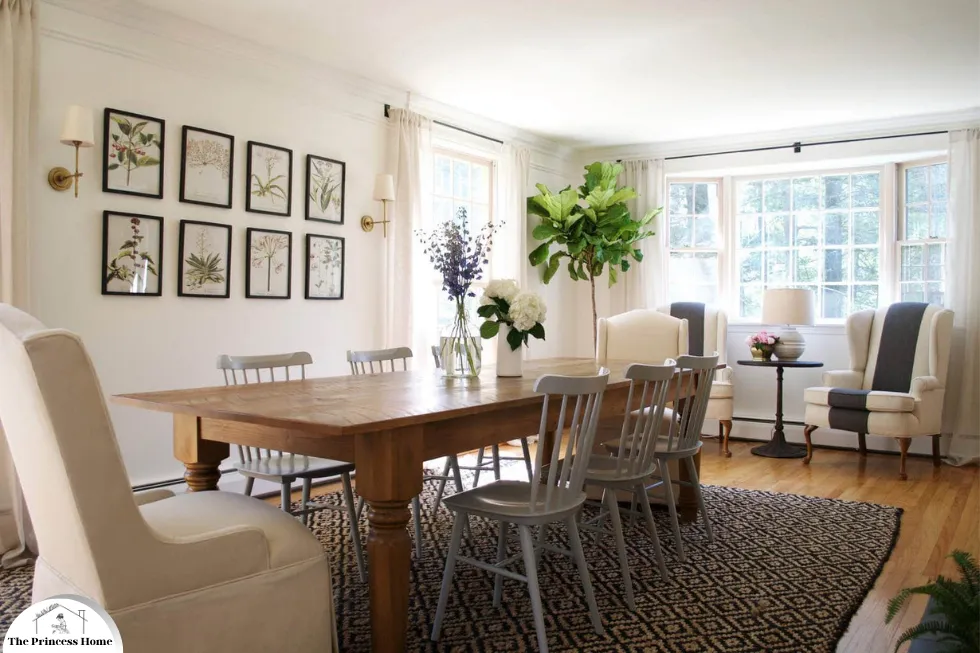 Choose a sturdy farmhouse dining table as the centerpiece of the room. Look for a table made of reclaimed wood or with a distressed finish for an authentic farmhouse look. A large, rectangular table is ideal for accommodating family and guests.