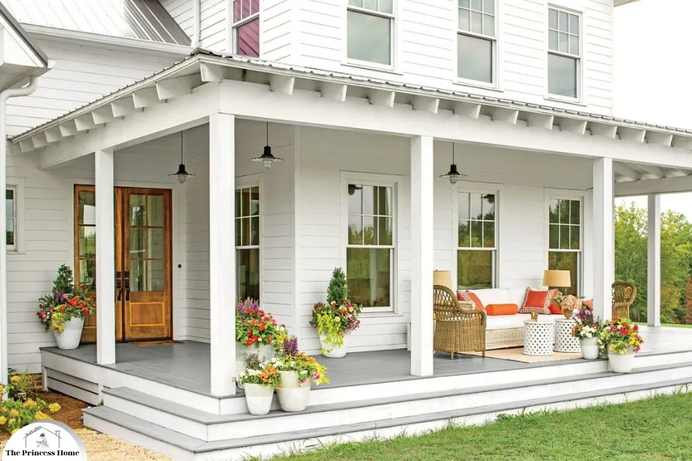 A spacious wraparound porch is a hallmark of farmhouse architecture. It provides ample space for outdoor living, relaxing, and socializing with family and friends. The porch may be adorned with rocking chairs, porch swings, and potted plants.