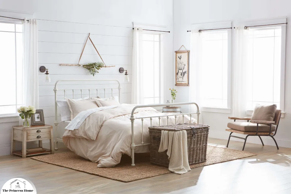 Lay down a natural fiber rug such as jute, sisal, or seagrass to add warmth and texture to the bedroom floor. These rugs complement the farmhouse style and bring a touch of nature indoors.