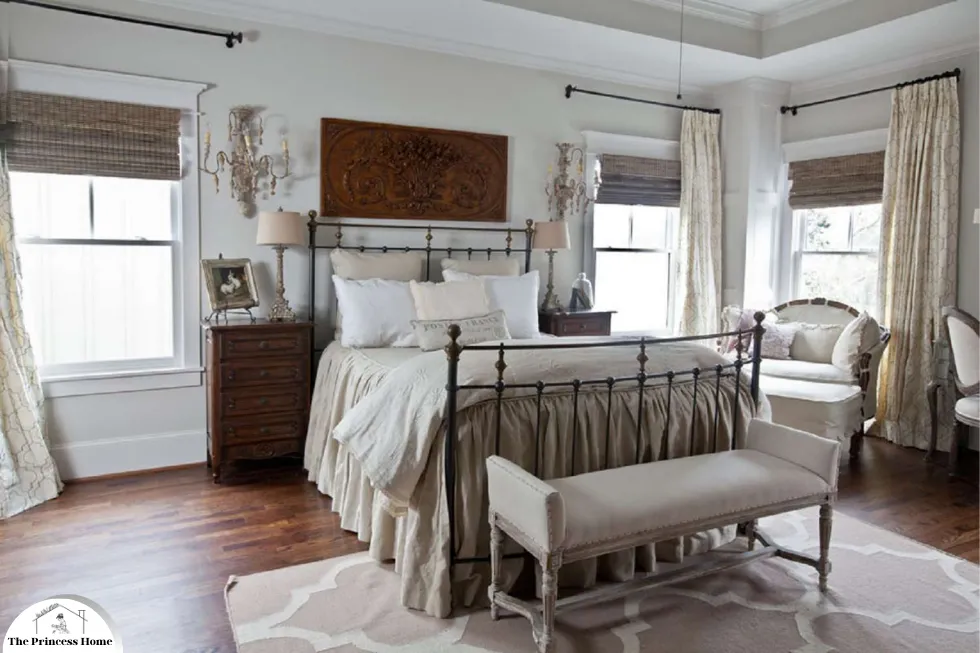 To create a cozy and inviting bedroom with farmhouse style, choose a four-poster or canopy bed with a distressed finish or a wrought-iron frame. Use vintage quilts, linen duvets, and fluffy down comforters for bedding.