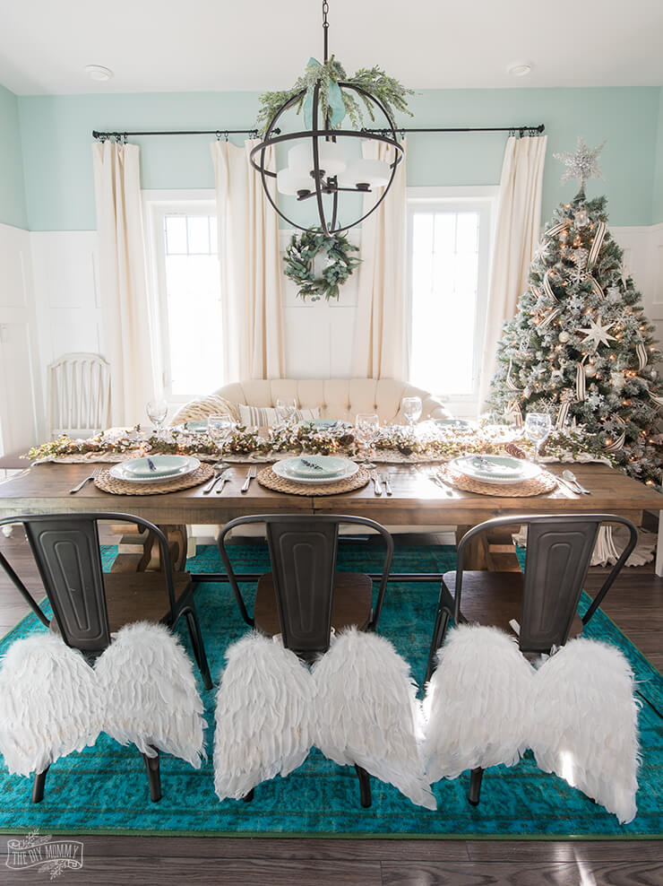 - Hang small Christmas ornaments from the back of chairs or scatter them on the table for an extra festive touch.