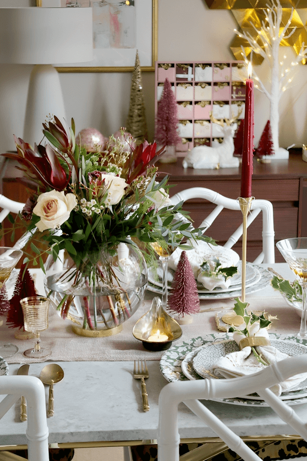 - A classic choice, a bouquet of red and white flowers or poinsettias can add a touch of elegance and color to your table.