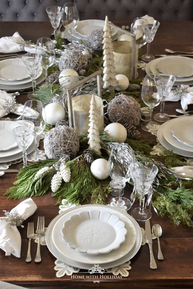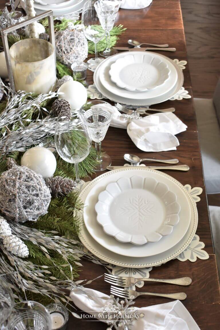 - Transform your table into a snowy paradise with white and silver decorations, snowflake motifs, and icy blue hues.