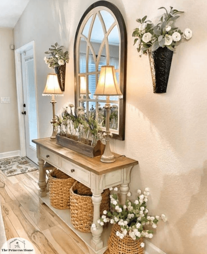 Create visual interest by layering decor elements in your entryway. For instance, layer a decorative tray on top of a console table, place a couple of books or small sculptures on the tray, and then add a vase of fresh flowers or a unique decorative piece. Layering adds depth and complexity to the decor, making it more visually appealing.