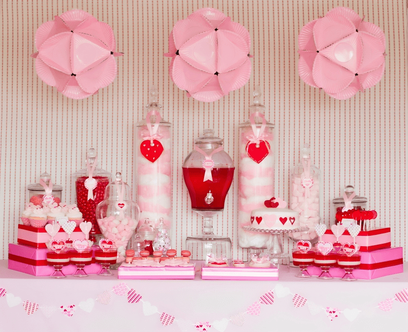 - A candy-themed party with a candy bar, heart-shaped chocolates, and lollipops.