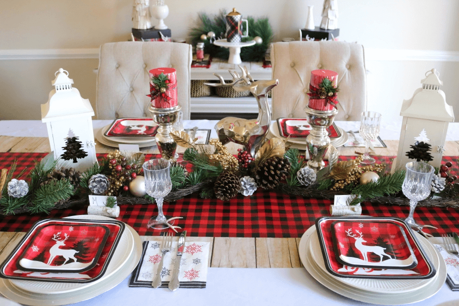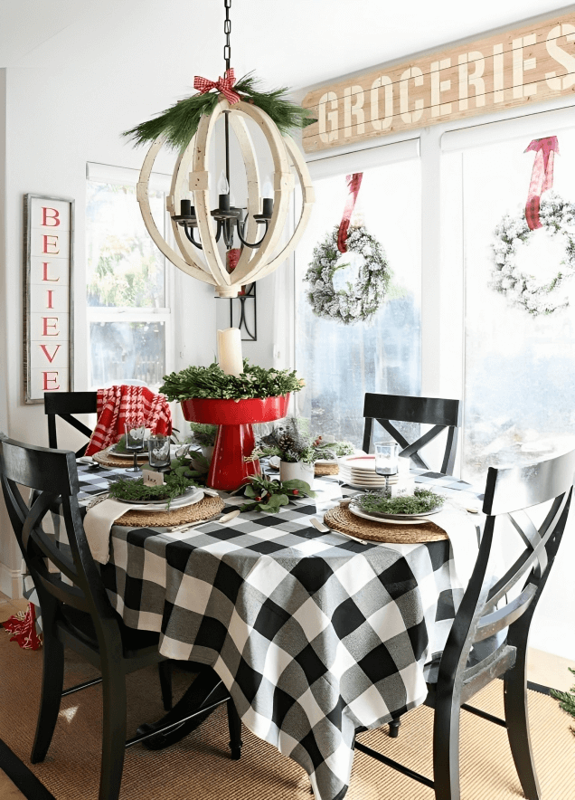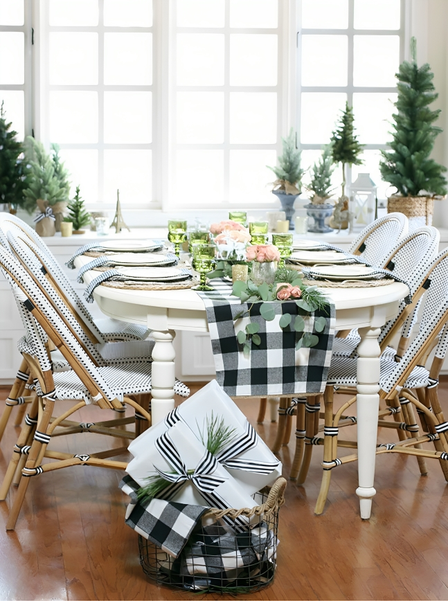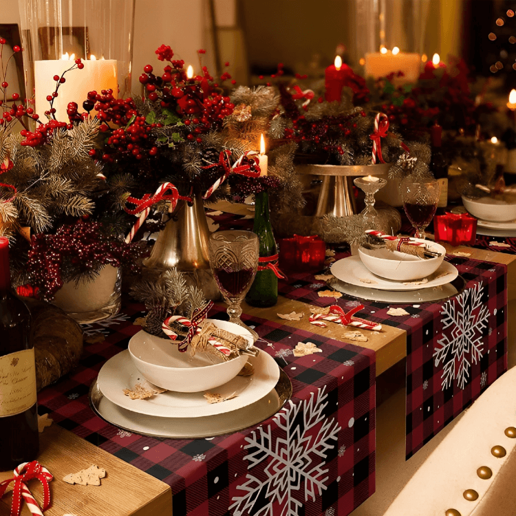 Set your Christmas dinner table with Buffalo check tablecloths, placemats, and napkins. This creates a cohesive look for your holiday gatherings.