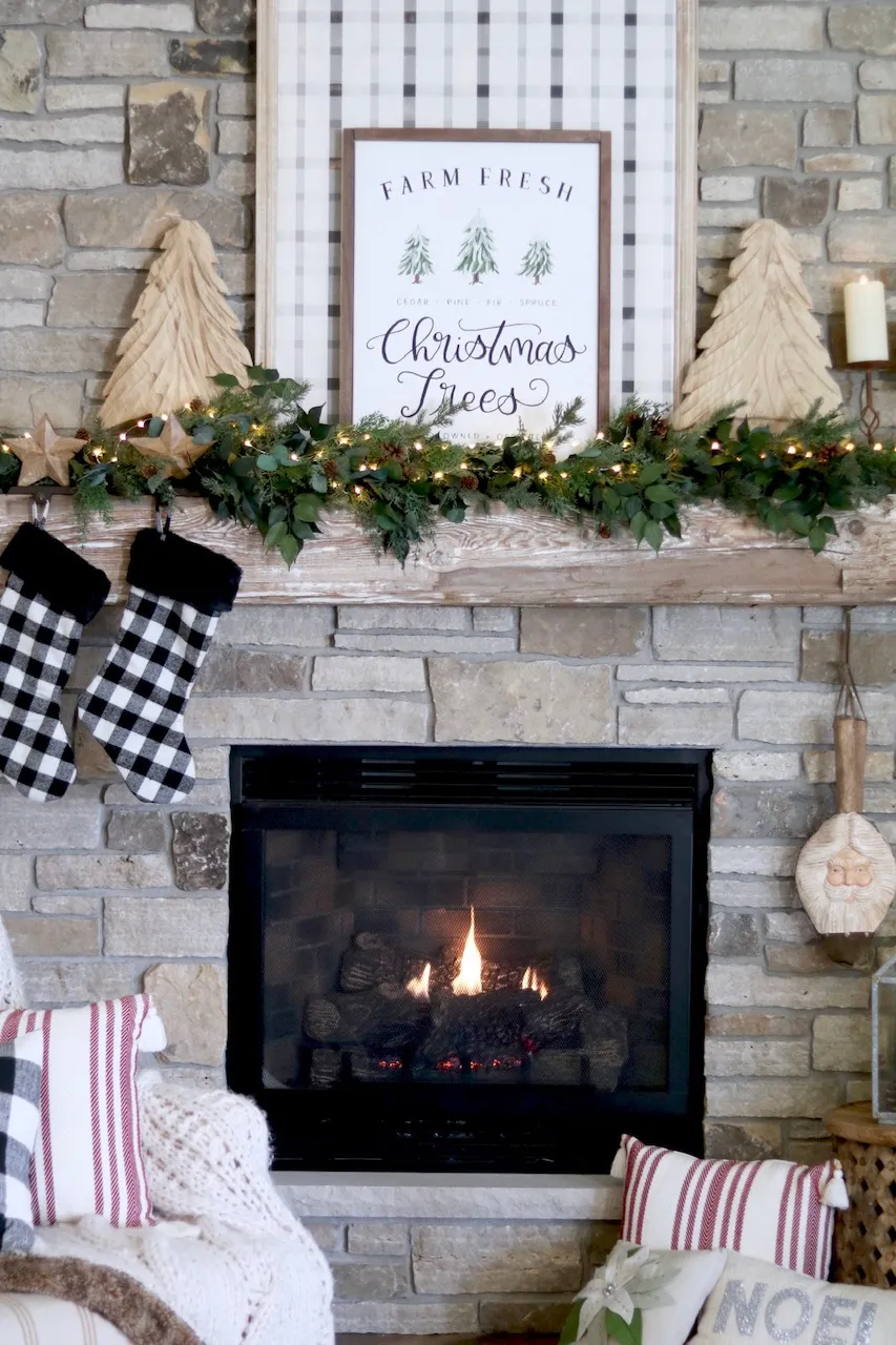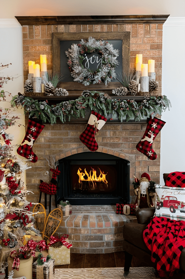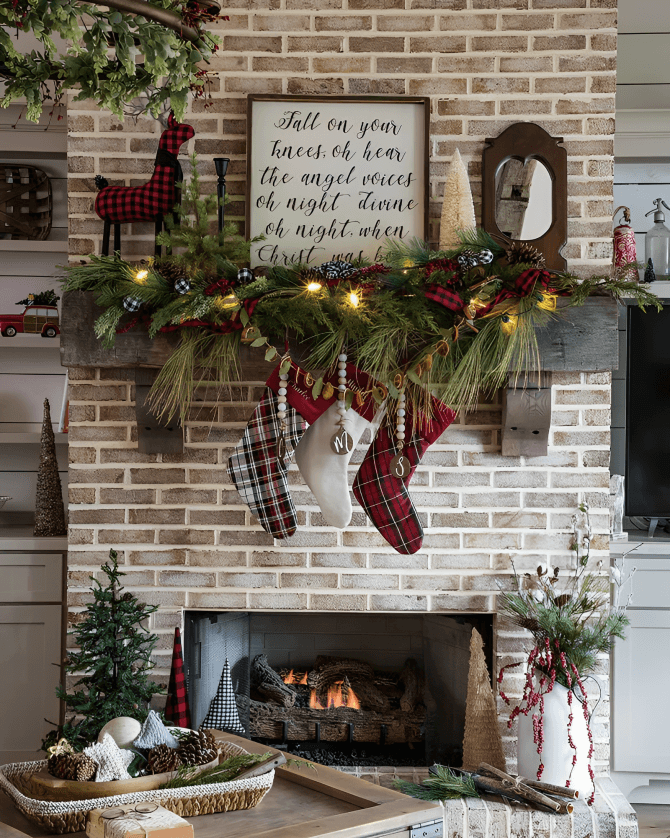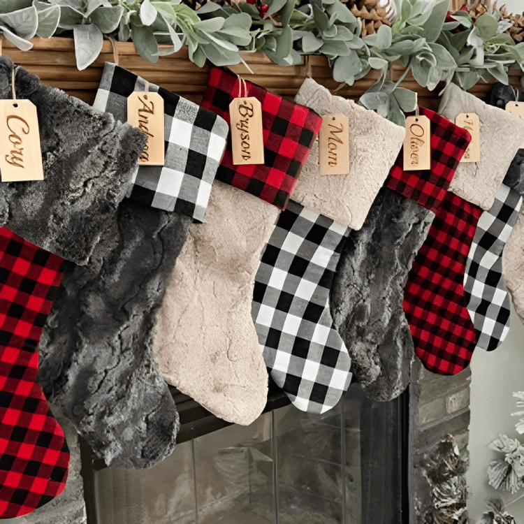 Hang Buffalo check stockings from the fireplace mantel or a dedicated stocking hanger. Personalize each stocking for a unique touch.