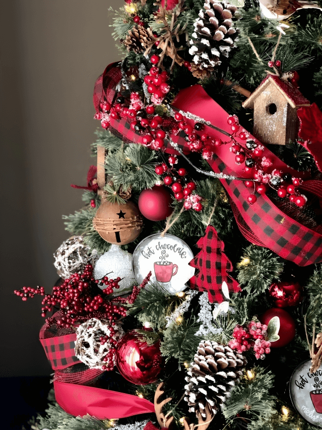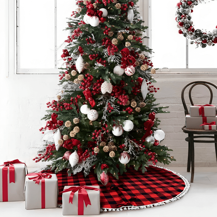 Start by selecting a Buffalo check tree skirt as the base for your Christmas tree. It adds an immediate touch of style and anchors your theme.