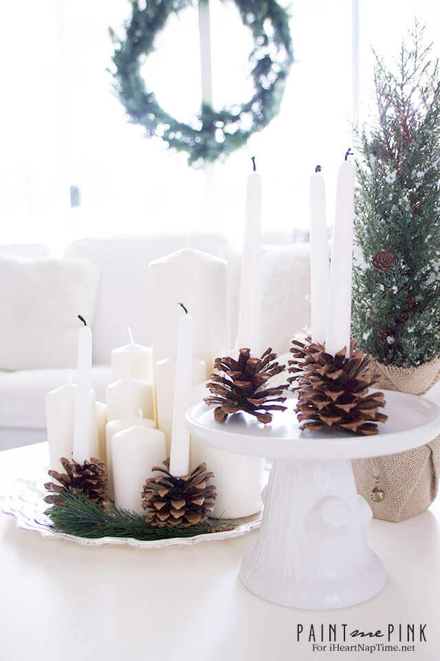 Create a captivating candlescape by placing different-sized candles among a bed of pine cones. This arrangement not only adds a warm and inviting ambiance to any room but also showcases the natural beauty of pine cones.
