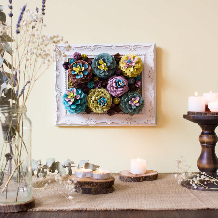 Get creative and make pine cone wall art to adorn your living spaces. Arrange pine cones in the shape of a tree, heart, or any design of your choice on a canvas or wooden board. Secure them with hot glue and paint or decorate the background to suit your style. Hang your pine cone masterpiece as a focal point in your home.