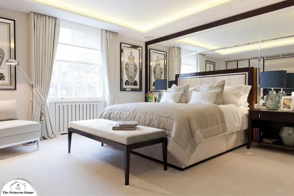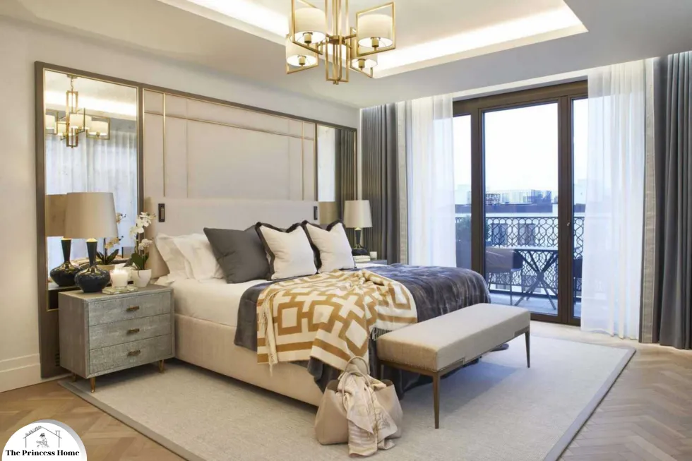 2.Furniture: Choose sleek and elegant furniture pieces in neutral tones, such as a plush upholstered headboard, a polished wooden bed frame, or a tufted ottoman at the foot of the bed. Consider pieces with metallic accents for a touch of glamour.